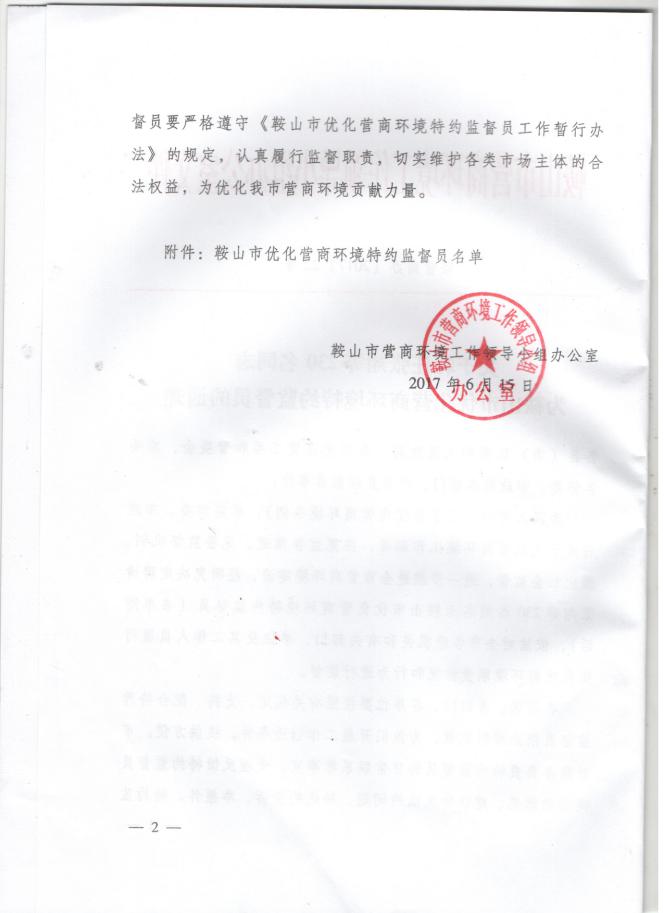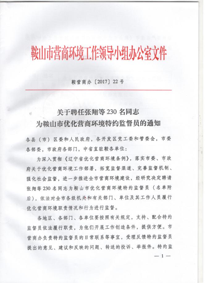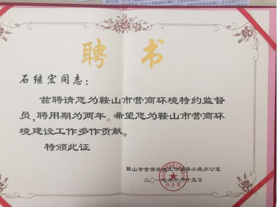 Congratulations to Mr. Shi Jihong, Chairman of the Libang Group, who was hired as supervisor by Anshan Optimization Business Environment
