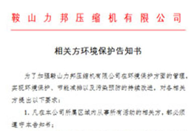 為了加強(qiáng)鞍山力邦壓縮機(jī)有限公司在環(huán)境保護(hù)方面的管理,實現(xiàn)環(huán)境保護(hù)、節(jié)能減排以及污染預(yù)防的持續(xù)改進(jìn),對各相關(guān)方提出以下要求: